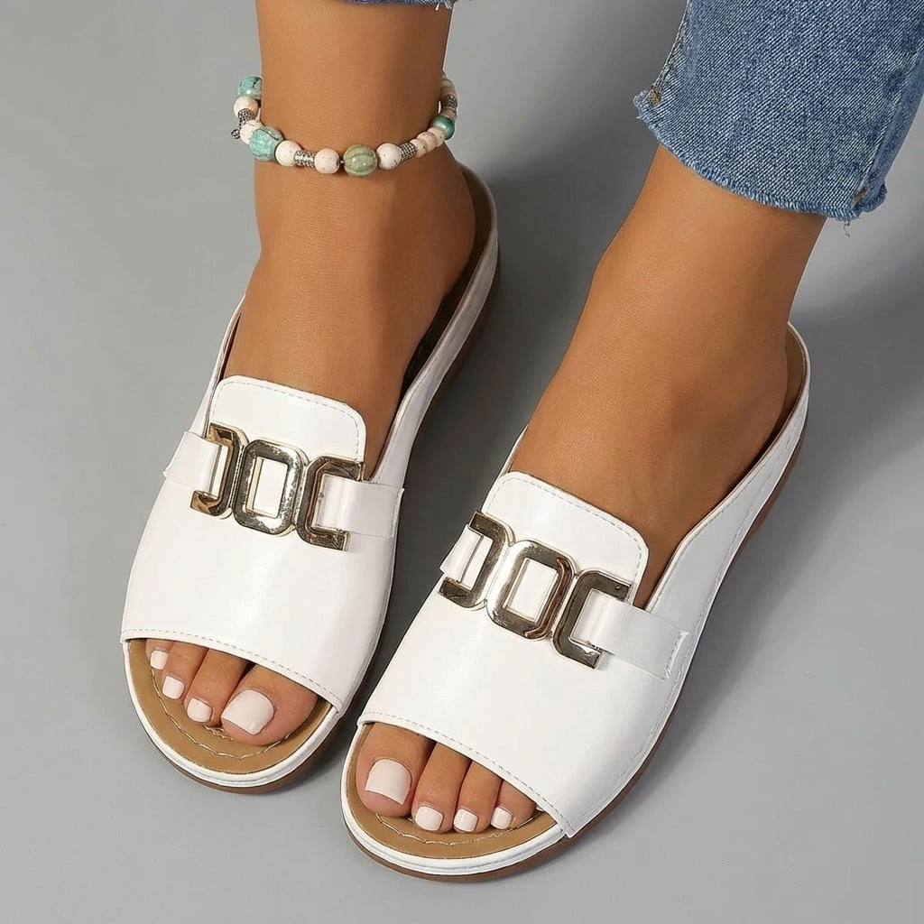 These women’s slip on sandals feature a smooth, Orthopedic structured upper with a polished gold buckle detail for a clean, elevated look. Designed with an open toe and easy slide-on shape, they offer quick comfort for warm-weather days. The flat sole keeps the silhouette minimal and versatile, making them easy to pair with denim, dresses, or everyday casual outfits. A refined option for travel, weekends, and relaxed daily styling.