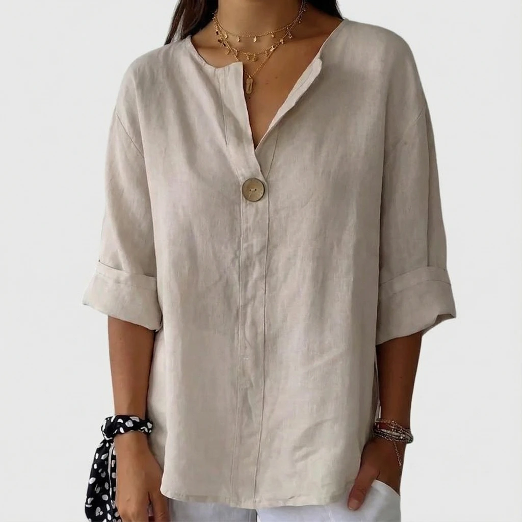 This blouse features a clean, relaxed silhouette designed for effortless everyday wear. The minimal button front adds subtle structure, while the loose fit creates a comfortable, easy drape. Finished with a timeless profile, this piece pairs seamlessly with both casual and refined looks.